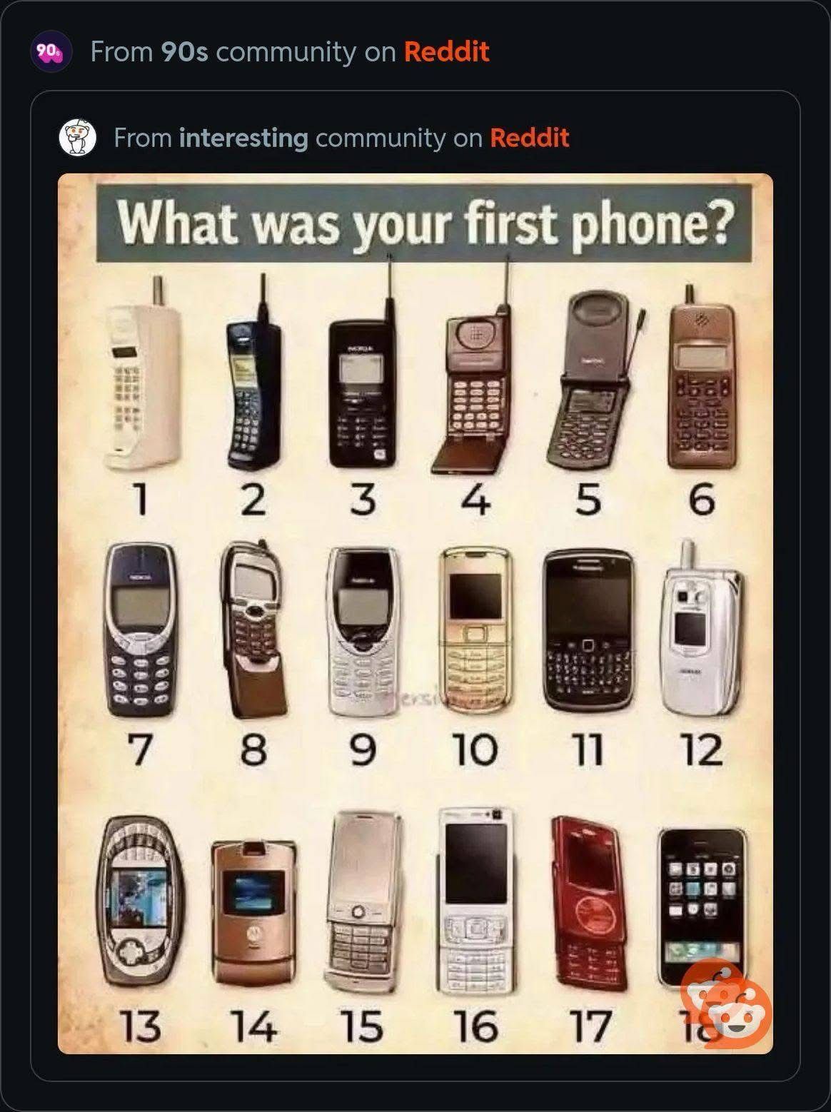 My parents had Ericson (sp?) phones like #6 in the 90s, my first cell phone was senior year of college, a flip (like #12) and later a slide (like #15). Eventually I got a Blackberry Storm (iPhone-ish) and I think briefly an Android before I jumped over to the iPhone 4. I think I made the move after seeing my brother take a photo with his iPhone and the insanely good quality jump.